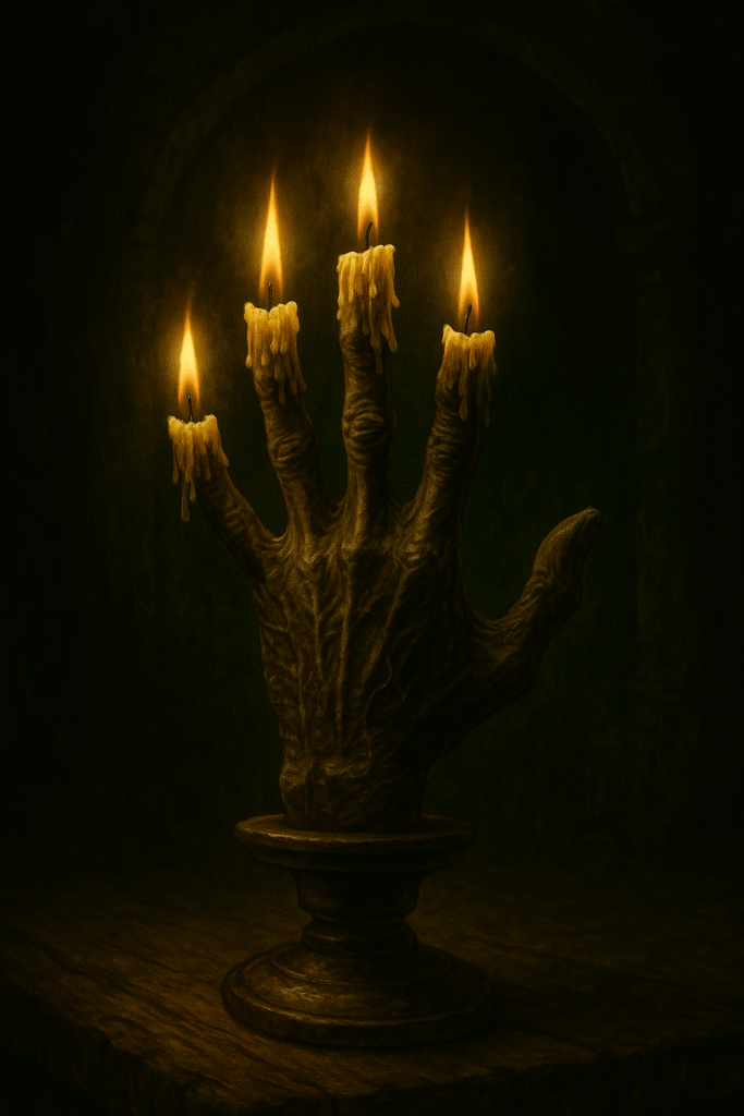They say it was cut from the wrist of a hanged man, still warm from his last breath. The fingers, once instruments of sin, were dried in graveyard ash and waxed with tallow from the same man’s fat. When lit, it was said to burn with a ghostly flame — one that no wind could extinguish.